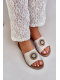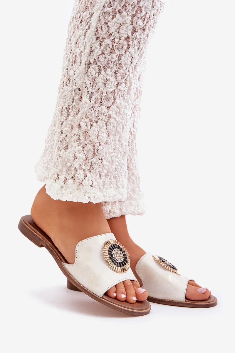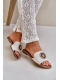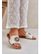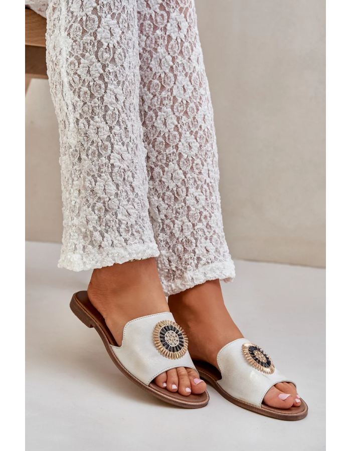 Dámské pantofle Lewski ve zlatém provedení s jemným patinovaným efektem spojují elegantní vzhled s maximálním pohodlím. Kožený svršek je doplněn dekorativním prvkem, který dodává obuvi stylový a sofistikovaný charakter. Plochý podpatek zajišťuje komfortní nošení po celý den, zatímco otevřený střih umožňuje snadné obouvání a příjemné nošení v teplých dnech.