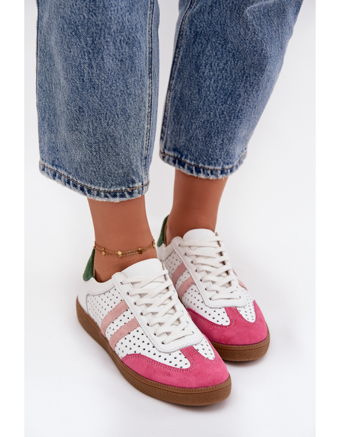 Lehké kožené dámské tenisky na pohodlné podrážce, s elegantním ažurovým designem a jemnými růžovými detaily. Ideální pro celodenní nošení v teplejších dnech.