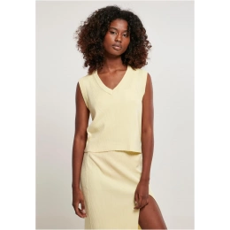 Tento zvýrazněný dámský top v klasickém pleteném provedení se prezentuje jako elegantní a ženský doplněk. Nabízí hluboký výstřih do V a mírně zkosená ramena, která jsou ohraničena a orámována jemnými pletenými manžetami. Vesta je zkrácena a končí v pase s lemem bez manžety. Je volného střihu a je vyrobena z jemného materiálového mixu polyesteru, viskózy a elastanu.