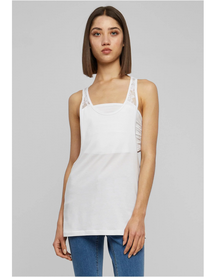 Díky atraktivní krajce na ramínkách a zádech lze toto volné tílko ze 100% bavlny nosit i na šik příležitosti. Efekt lze velmi specificky variovat určitými doplňky, a proto se nakonec hodí prakticky pro všechny příležitosti.
