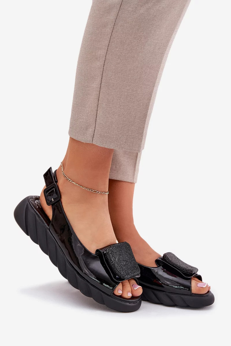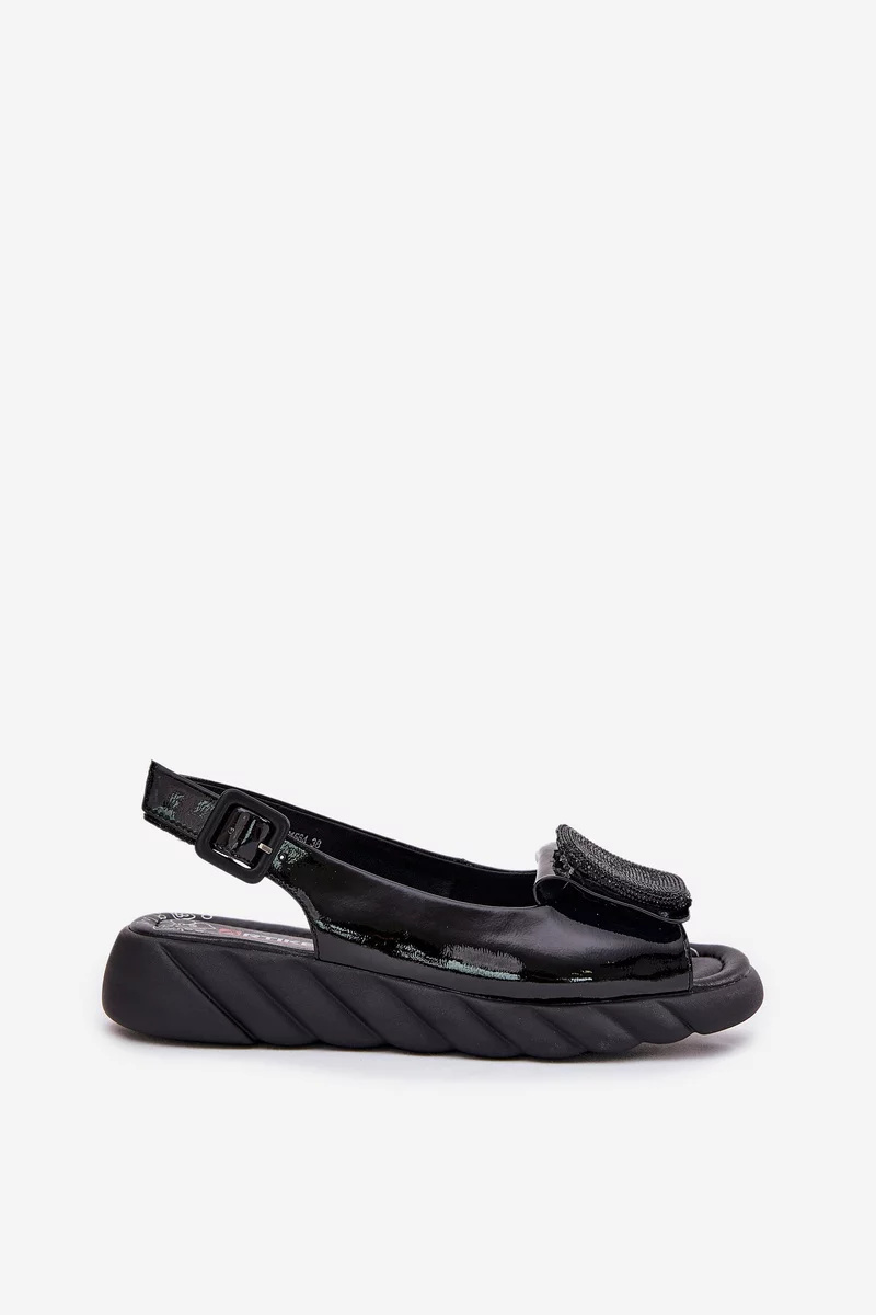 Stylové sandály Artiker z pravé lakované kůže v černém provedení s elegantní ozdobou na přední části. Stabilní klínek zajišťuje pohodlnou chůzi a dodává eleganci. Pásek kolem kotníku s přezkou poskytuje bezpečné a pevné nošení. Ideální volba pro slavnostní, společenské i každodenní letní outfity.