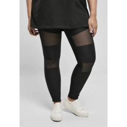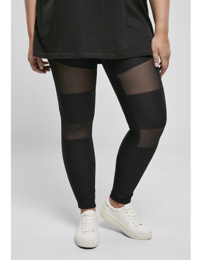 Tyto sexy legíny kombinují dva vzrušující designové prvky: elastickou žebrovanou tkaninu a funkční, ale průhledné síťované vsadky, které jsou také zodpovědné za vytvoření skutečného kousku pro tuto sezónu. Široké vsadky sedí diagonálně nad stehny a pod koleny. Dámské legíny přirozeně upřednostňují přiléhavý střih a jsou střiženy po kotníky.