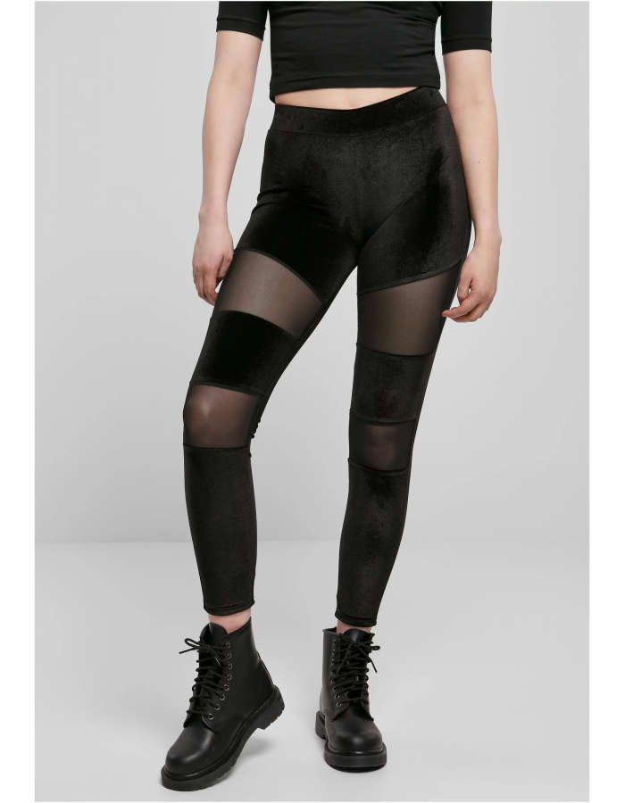 Tyto horké a pikantní legíny spoléhají na svou sofistikovanou směs materiálů z třpytivého strečového sametu a průhledné síťoviny. Síťované vložky na stehnech a kolenou rozhodně umožňují vidět podložní kůži. Poddajný sametový materiál výborně kontrastuje se síťovinou. Legíny přirozeně padnou jako druhá kůže. Jejich střih je nízký a pro optimální padnutí zůstává pas elastický.