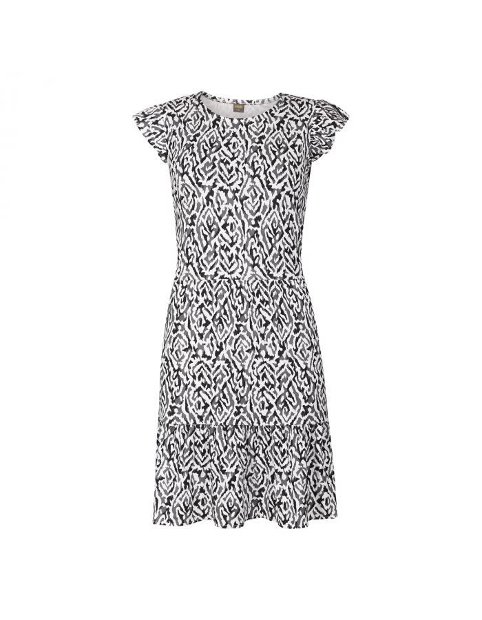 Polopřiléhavý střih se skvěle přizpůsobí postavě a zvýrazní siluetu, zatímco délka pod kolena a pásek v pase dodávají šatům elegantní a zároveň ležérní vzhled. Šaty zdobí decentní logo NAX, které podtrhuje jejich originální design.