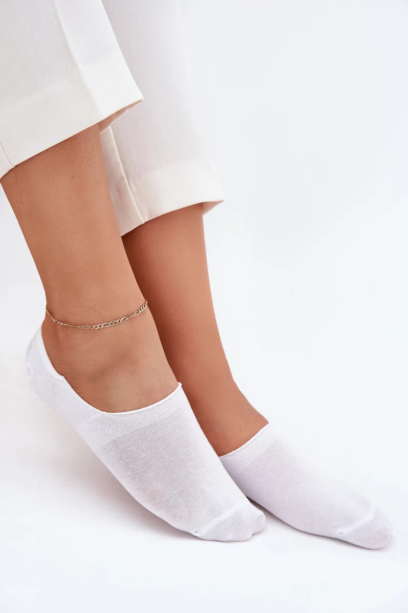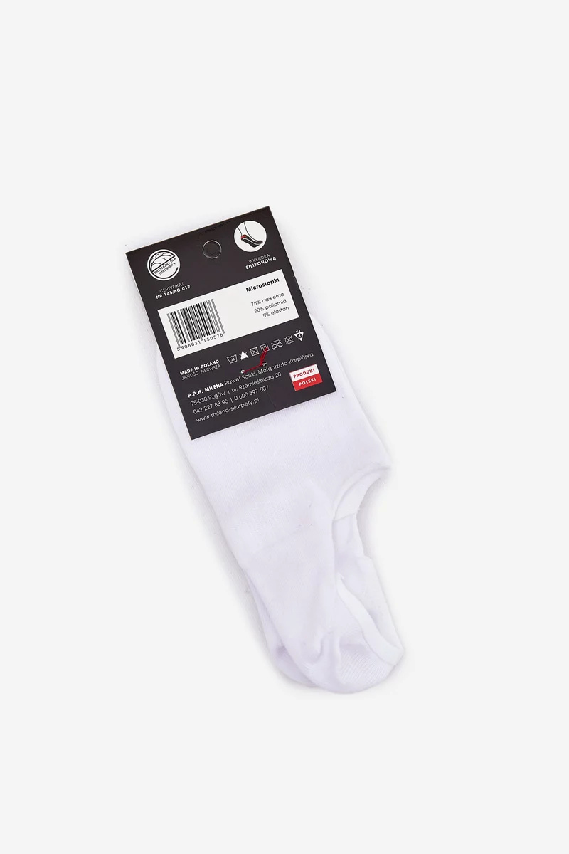 Bílé dámské mikro-kotníkové ponožky jsou měkké, pohodlné a ideální pro každodenní nošení. Kvalitní bavlněný materiál zajišťuje příjemný pocit na noze a dobrou prodyšnost. Jednobarevný design je nadčasový a snadno kombinovatelný s různou obuví a outfity.