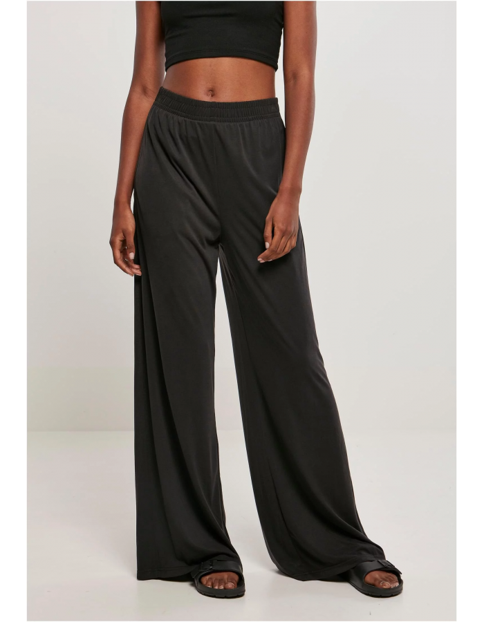 Díky širokým rovným nohavicím a splývavému tvaru, který je zdůrazněn vysokým pasem, se tyto dámské kalhoty prezentují noblesně a nadčasově. Pro dokonalé pohodlí při nošení je pas široký a elastický. Navíc jej lze dále upravit pomocí vnitřních stahovacích šňůrek. Dámské kalhoty jsou volného střihu vyrobené z hladkého modalového žerzeje.