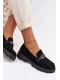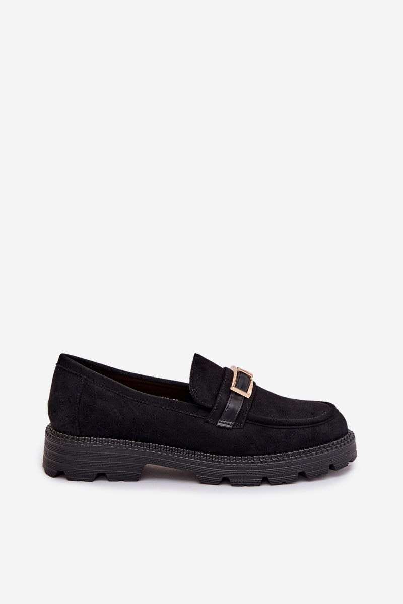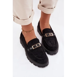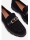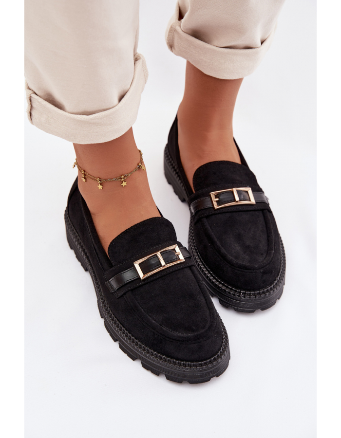 Černé mokasíny se zlatou přezkou skvěle doplní elegantní kalhoty, sukně i džíny a dodají outfitu upravený a nadčasový vzhled.