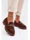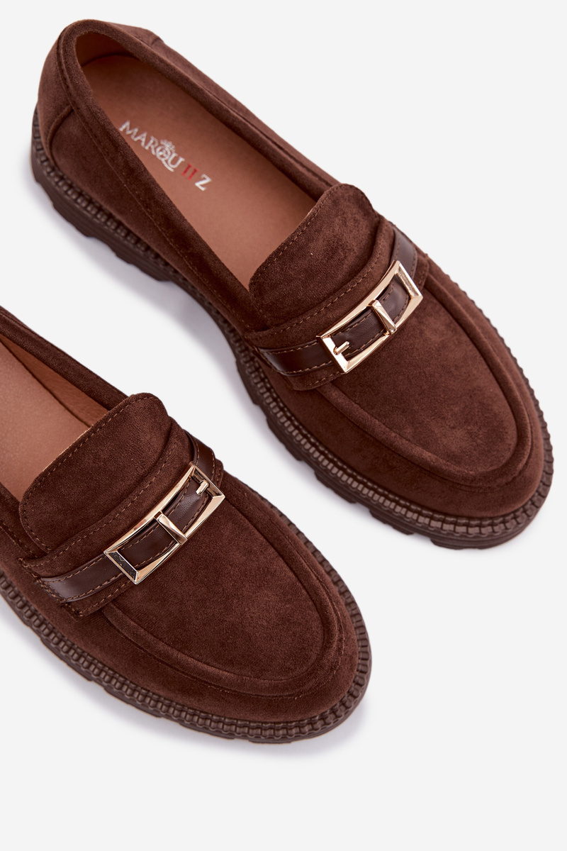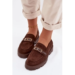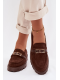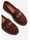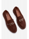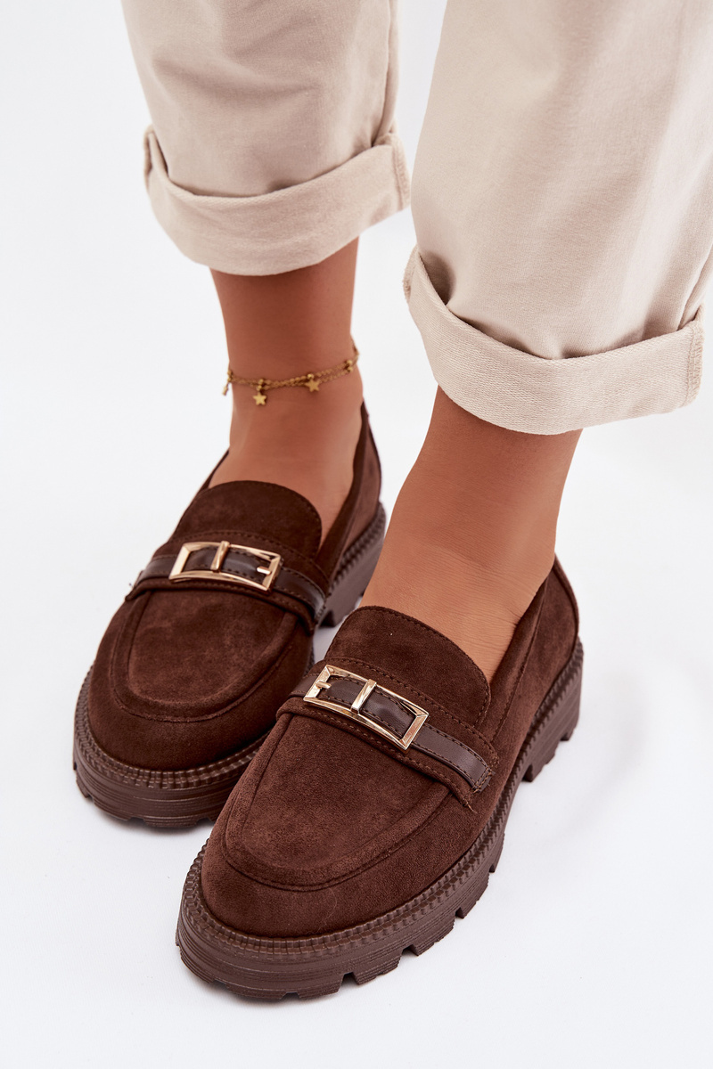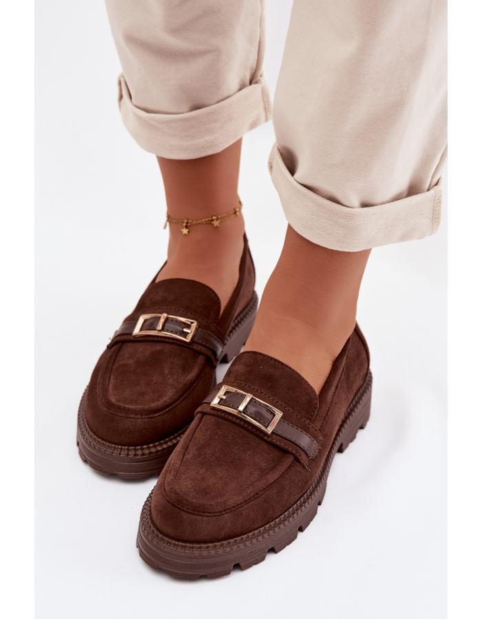 Čokoládové mokasíny se zlatou přezkou krásně doplní outfity v béžových, krémových nebo černých tónech a dodají jim elegantní akcent.