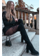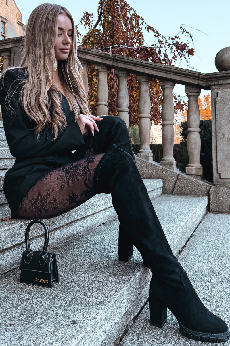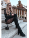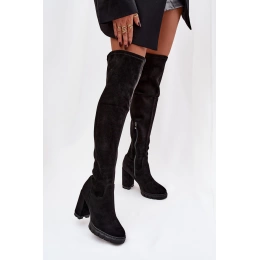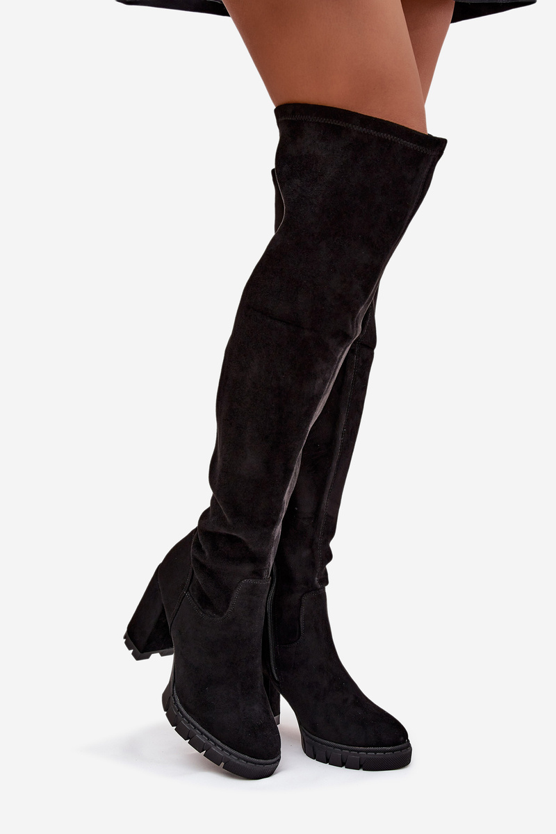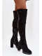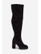 Černé nadkolenní kozačky Tahlina z eko‑semiše s pohodlným sloupkovým podpatkem (~ 7 cm). Mají praktický zip pro snadné nazouvání a univerzální elegantní design vhodný pro každodenní nošení i formálnější outfity. Vnitřní zateplení udržuje nohy v teple během chladných dní.