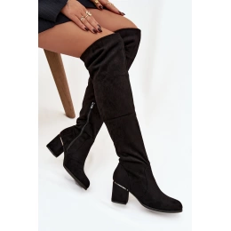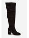 Černé nadkolenní kozačky Zaretta z eko‑semiše s pohodlným sloupkovým podpatkem (~ 7 cm). Mají boční zip pro snadné nazouvání a měkké vnitřní zateplení, které udržuje nohy v teple během chladnějších dní. Elegantní a univerzální design vhodný pro každodenní nošení i formální outfity.