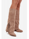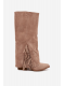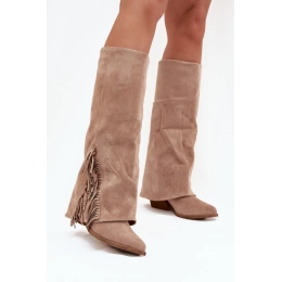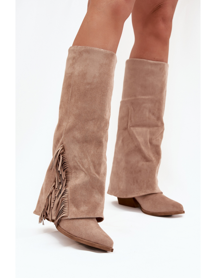 Béžové dámské nazouvací kovbojky Zalia se stabilním sloupkovým podpatkem (~ 6–7 cm) a ozdobnými třásněmi. Boty mají pohodlný střih bez zipu pro snadné nazouvání a měkké vnitřní zateplení, které udržuje nohy v teple během chladných dní. Stylový design vhodný pro každodenní nošení i výrazné outfity.