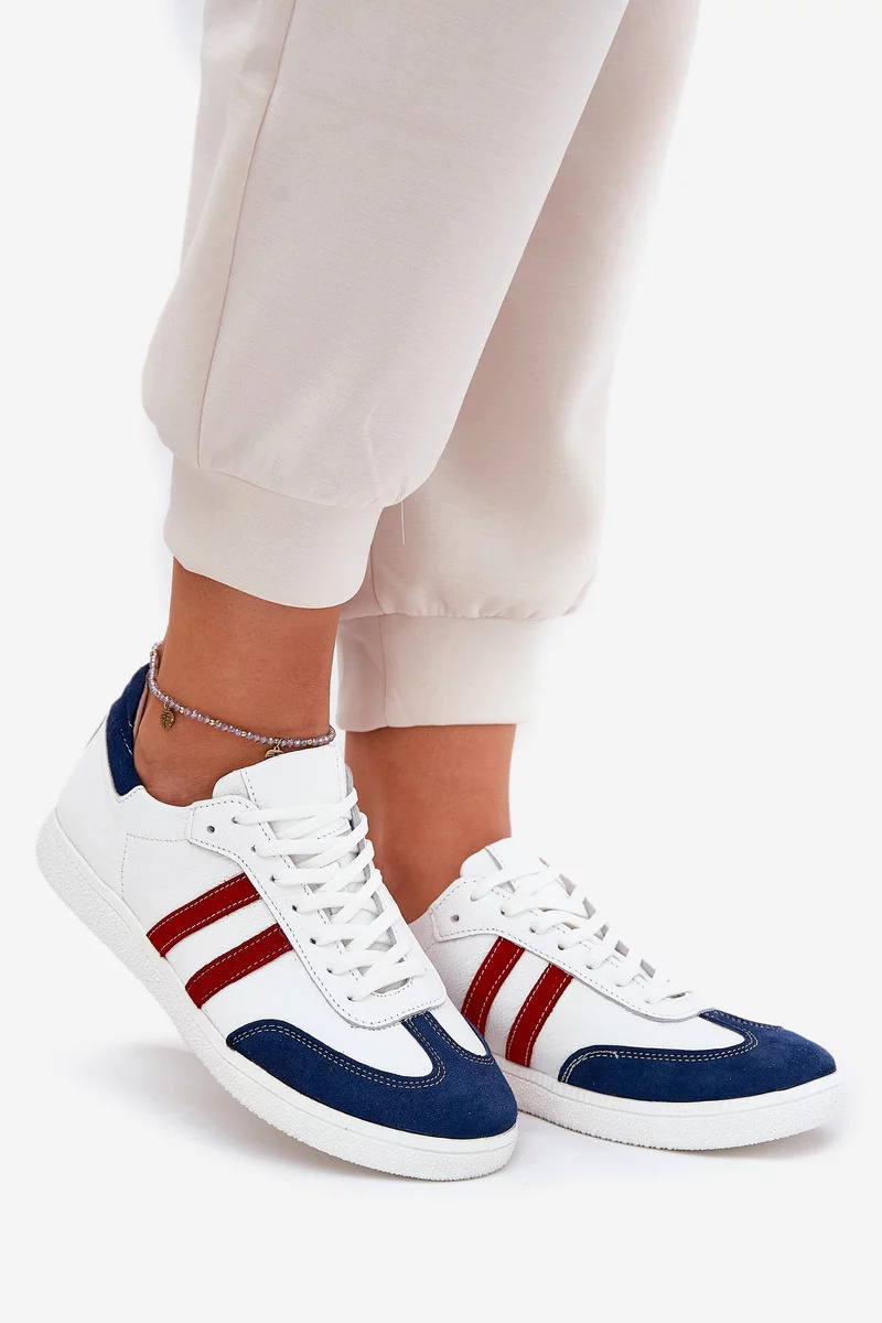 Dámské nízké sneakersy Zazoo v bílo-tmavě modrém provedení kombinují nadčasový design s kvalitním koženým zpracováním. Kontrastní barevná kombinace působí sportovně a zároveň elegantně, díky čemuž se obuv snadno kombinuje s každodenními outfity. Nízký střih poskytuje pohodlí a volnost pohybu při celodenním nošení.