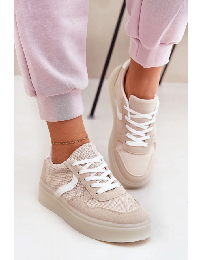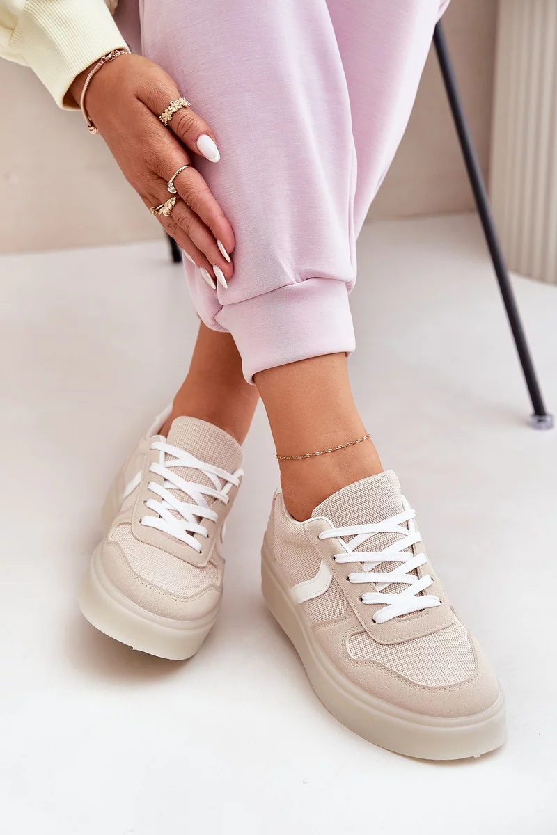 Béžové nízké tenisky na platformě krásně doplní outfit s džínami, sukní i šaty a dodají mu moderní, lehký vzhled.