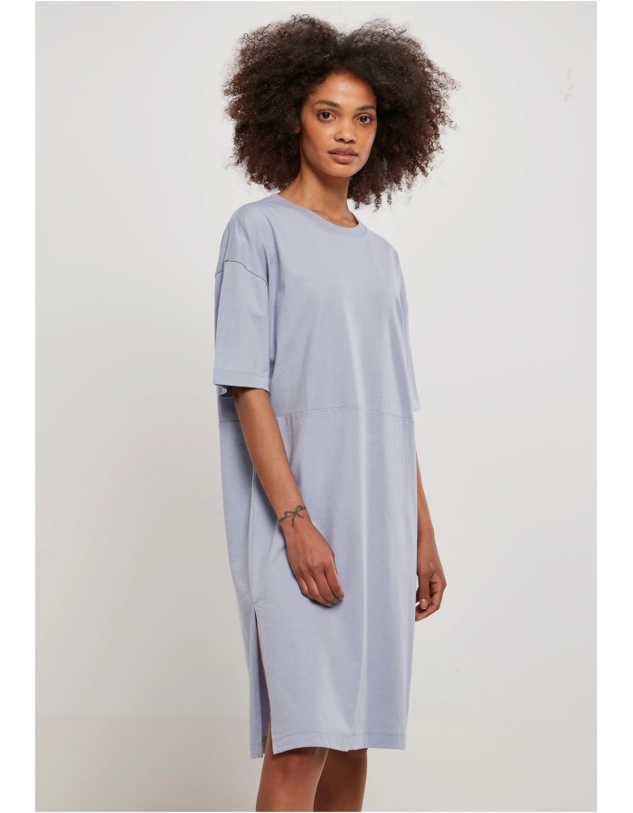 Tyto krásné dámské šaty ve stylu trička, vybavené dlouhými rozparky na obou stranách, upoutají pozornost. Rukávy jsou široké, šikmé a sahají téměř k loktům. Střih je ke kolenům, výstřih je kulatý. Dělící šev v pase zajišťuje dokonalý tvar a ladí s celkovým oversize střihem. Smyslné dámské šaty jsou vyrobeny z organické bavlny a jsou opatřeny štítkem s vlajkou na boku a doprovodným ekologickým štítkem.