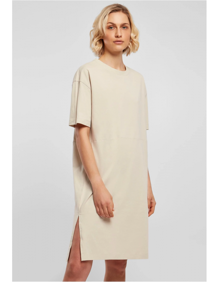 Tyto krásné dámské šaty ve stylu trička, vybavené dlouhými rozparky na obou stranách, upoutají pozornost. Rukávy jsou široké, šikmé a sahají téměř k loktům. Střih je ke kolenům, výstřih je kulatý. Dělící šev v pase zajišťuje dokonalý tvar a ladí s celkovým oversize střihem. Smyslné dámské šaty jsou vyrobeny z organické bavlny a jsou opatřeny štítkem s vlajkou na boku a doprovodným ekologickým štítkem.
