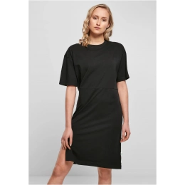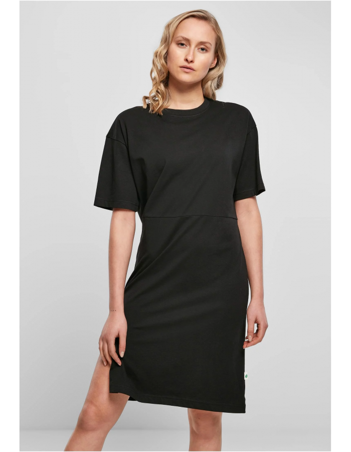 Tyto krásné dámské šaty ve stylu trička, vybavené dlouhými rozparky na obou stranách, upoutají pozornost. Rukávy jsou široké, šikmé a sahají téměř k loktům. Střih je ke kolenům, výstřih je kulatý. Dělící šev v pase zajišťuje dokonalý tvar a ladí s celkovým oversize střihem. Smyslné dámské šaty jsou vyrobeny z organické bavlny a jsou opatřeny štítkem s vlajkou na boku a doprovodným ekologickým štítkem.