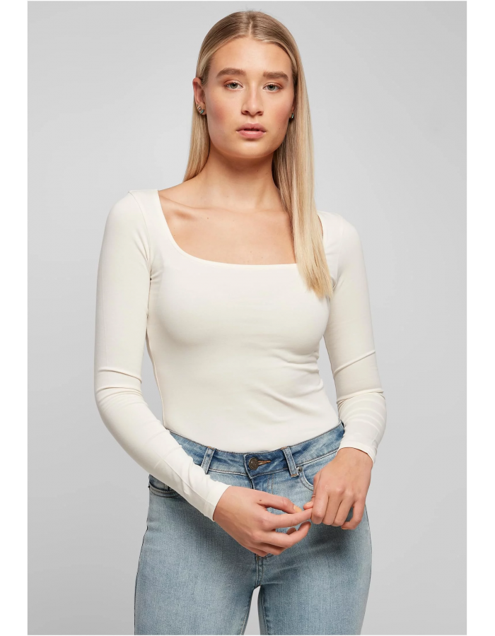 Toto jednobarevné body má super velkorysý hranatý výstřih. Jako tělo s dlouhým rukávem se zapíná na tři kovové druky v rozkroku, což umožňuje dvě různé úpravy velikosti. Tělo je vyrobeno z organického strečového žerzeje a je velmi přiléhavé. Doprovodný štítek jej identifikuje jako organický kus oblečení.
