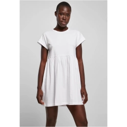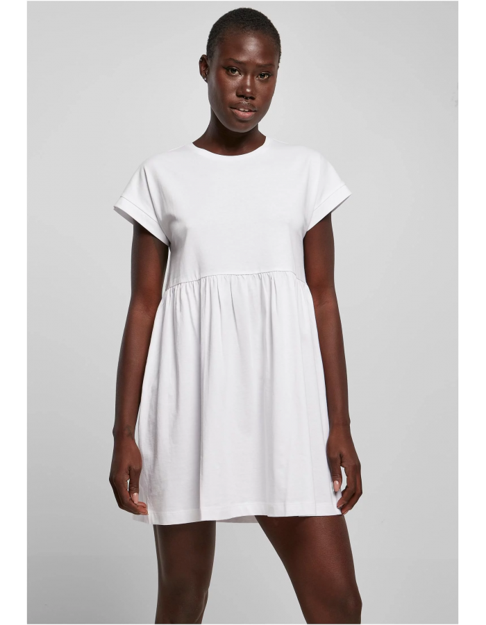 Šaty okouzlují ženským šarmem: navazují na empírový styl; sukně padá v jemných záhybech z vysokého pasu. Vzhled dotváří malý kulatý výstřih, krátké šikmé rukávy a sexy mini střih. Zvolený volný střih a pohodlná látka z organické bavlny dělá radost nosit.