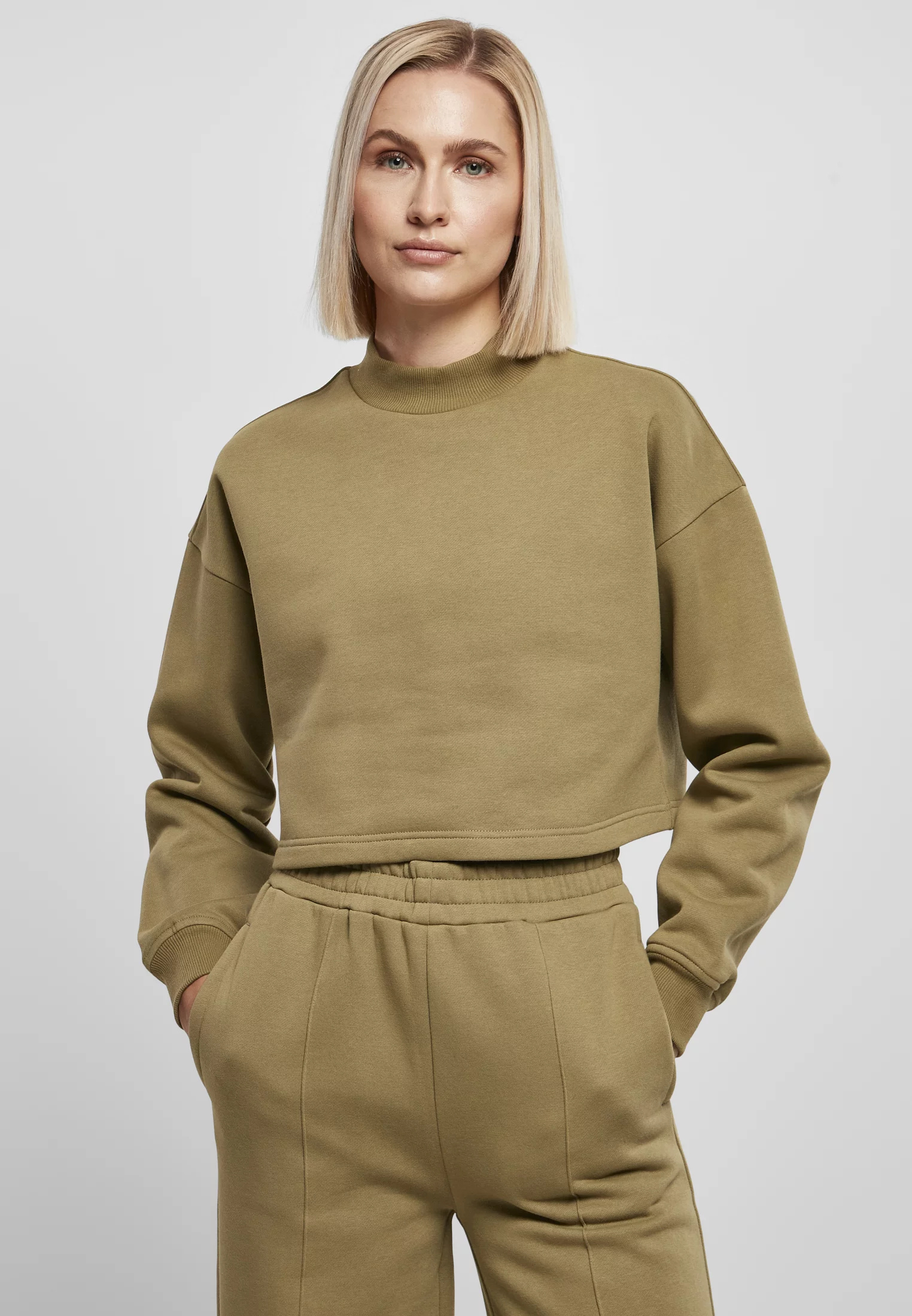 Tato dámská mikina vyrobená z hladkého česaného fleecu je stejně pohodlná jako sexy. Dlouhé rukávy se širokými žebrovanými manžetami a malým žebrovaným límcem hravě vyznívá zkrácený střih. Volný střih mikiny se širokými spadlými rameny se dokonale hodí k ležérnímu vzhledu.