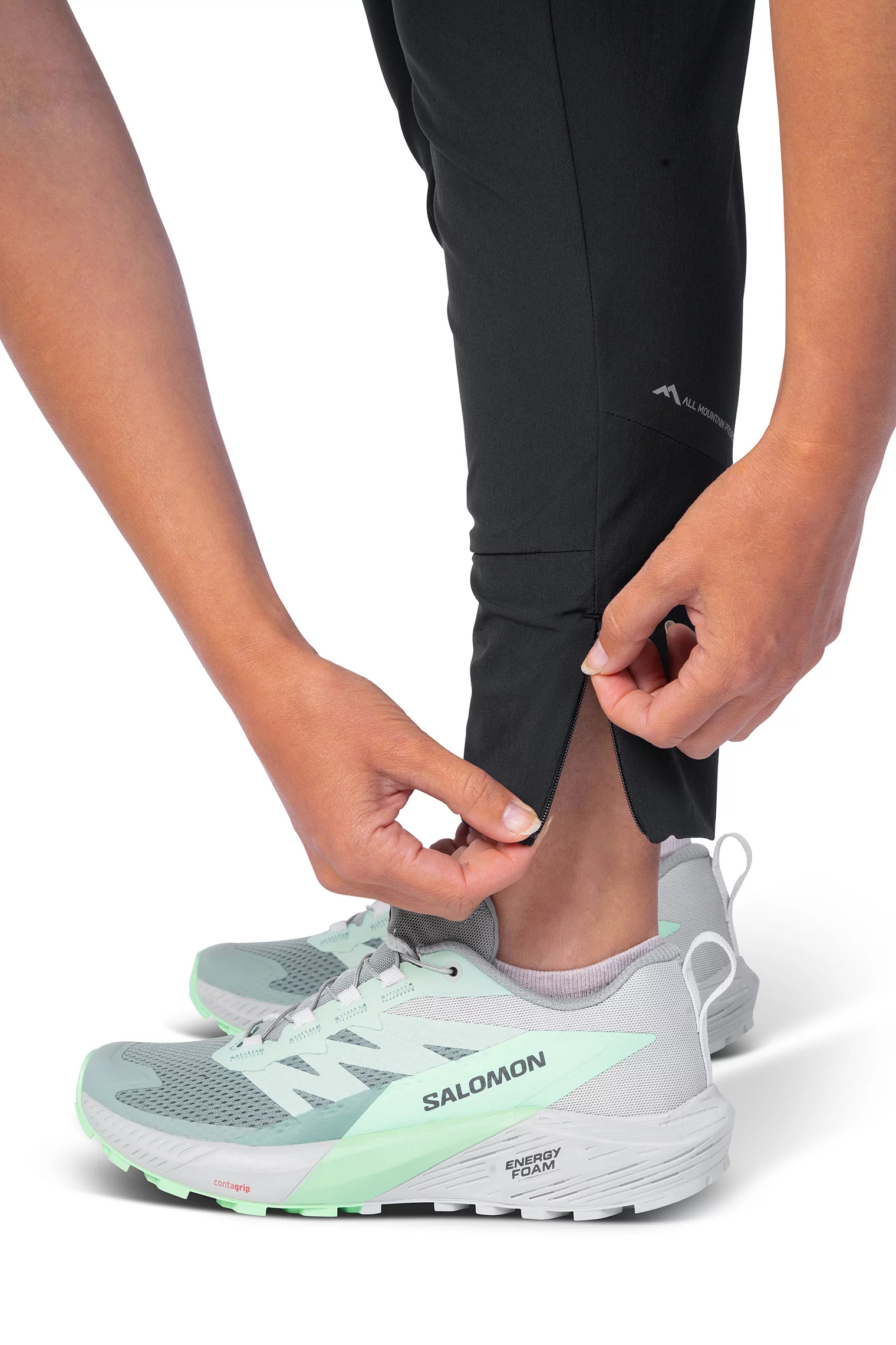 Dámské lehoučké a zároveň vysoce mechanicky odolné kalhoty pro širokou škálu letních outdoorových aktivit. Příjemný elastický pas do gumy má integrovanou šnůrku pro ještě lepší přizpůsobení obvodu pasu. Ergonomický střih kalhot, natvarovaná kolena a vysoce elastický materiál pro svobodný, neomezený pohyb. Spodní část nohavice přehází do zúžení s možností rozšíření díky rozparku se skrytým zipem. Kalhoty disponují dvěma prostornými kapsami v přední částí a jednou stehenní volně přístupnou kapsou. Designovým prvkem jsou printované vnitřní kapsy. Materiál kalhot je navíc ošetřen povrchovou vodoodpudivou úpravou (DWR-C0), která je bez fluorkarbonů, a tím je šetrnější k životnímu prostředí (PFC free).