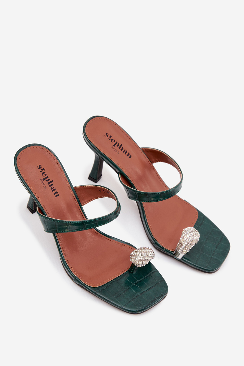 Dámské pantofle Lorissa v lahvově zeleném provedení představují elegantní a výrazně ženský model, který zaujme ozdobným detailem na nártu. Jehlový podpatek dodává obuvi sofistikovanou siluetu a opticky prodlužuje nohy, zatímco otevřený střih působí lehce a moderně. Hluboký zelený odstín působí luxusně a originálně, díky čemuž jsou pantofle ideální volbou pro výrazné elegantní outfity.