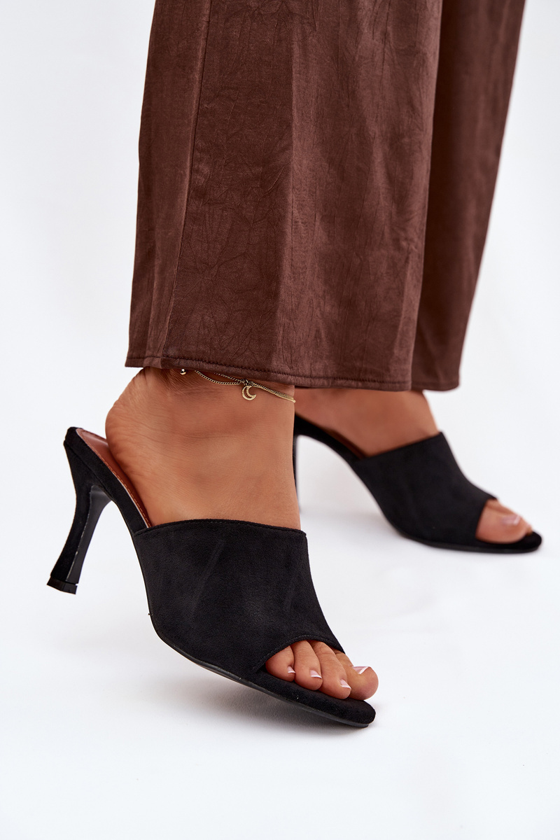 Černé pantofle na jehlovém podpatku se skvěle hodí k večerním šatům, elegantním kalhotám i minimalistickým outfitům, kde vynikne jejich sofistikovaný styl.