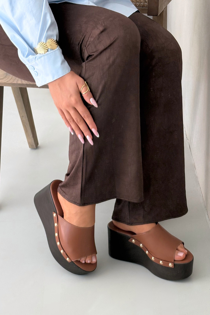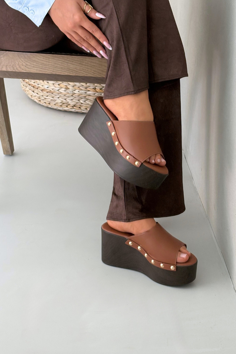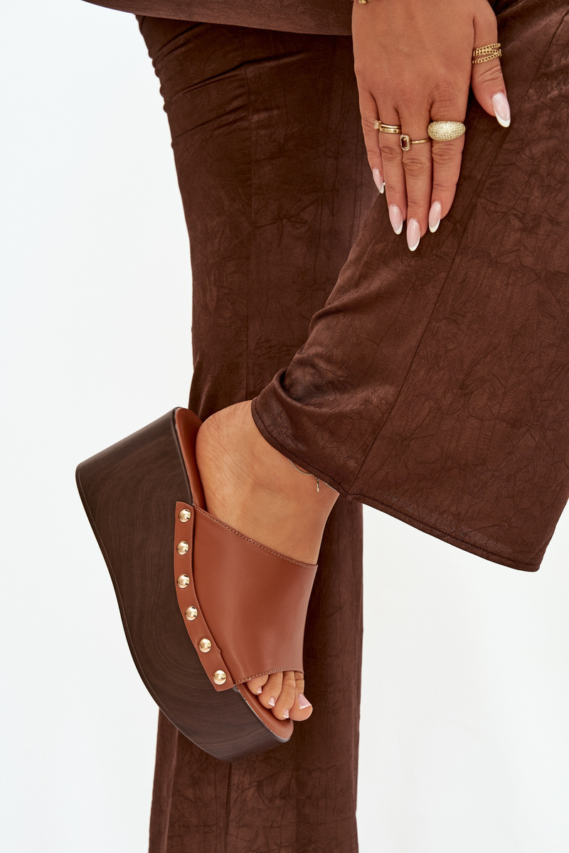 Camel pantofle na klínku s cvočky krásně doplní outfit v béžových, krémových nebo hnědých odstínech a podtrhnou přirozený letní styl.