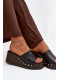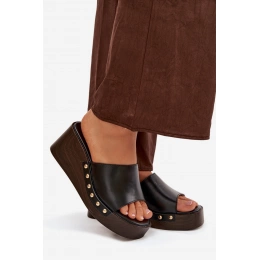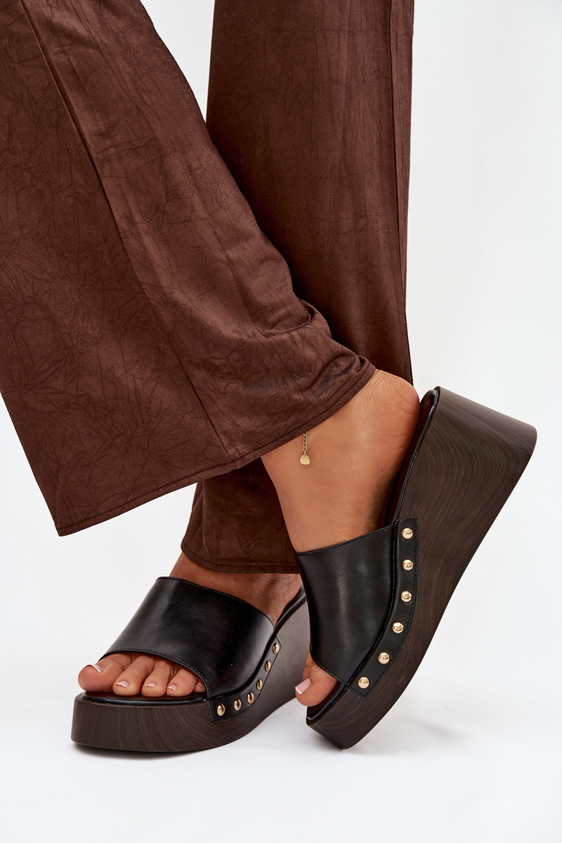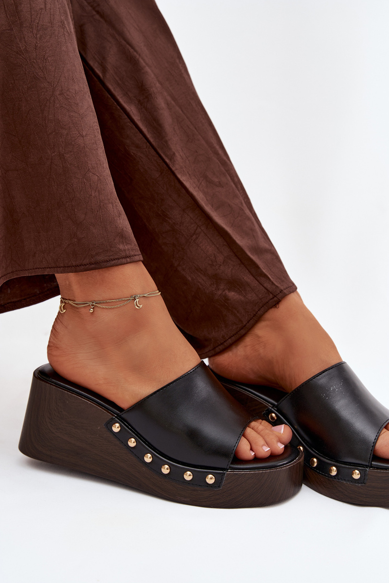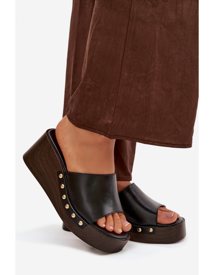 Černé pantofle na klínku se zlatými cvočky skvěle doplní jak jednoduchý, tak elegantnější letní outfit a dodají mu luxusní akcent.