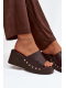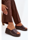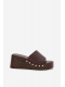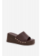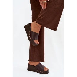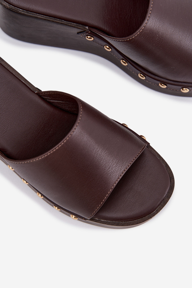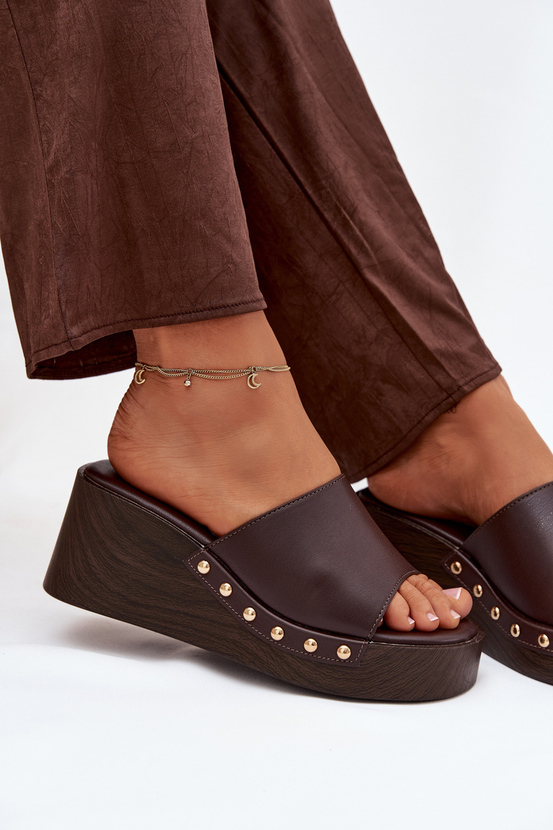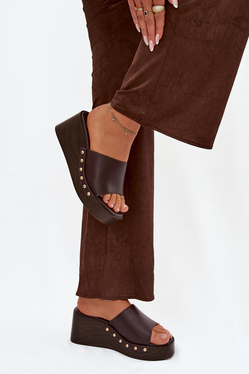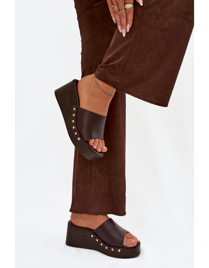 Čokoládové pantofle na klínku se zlatými cvočky krásně doplní outfit v béžových, krémových nebo bílých tónech a dodají mu elegantní akcent.