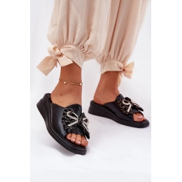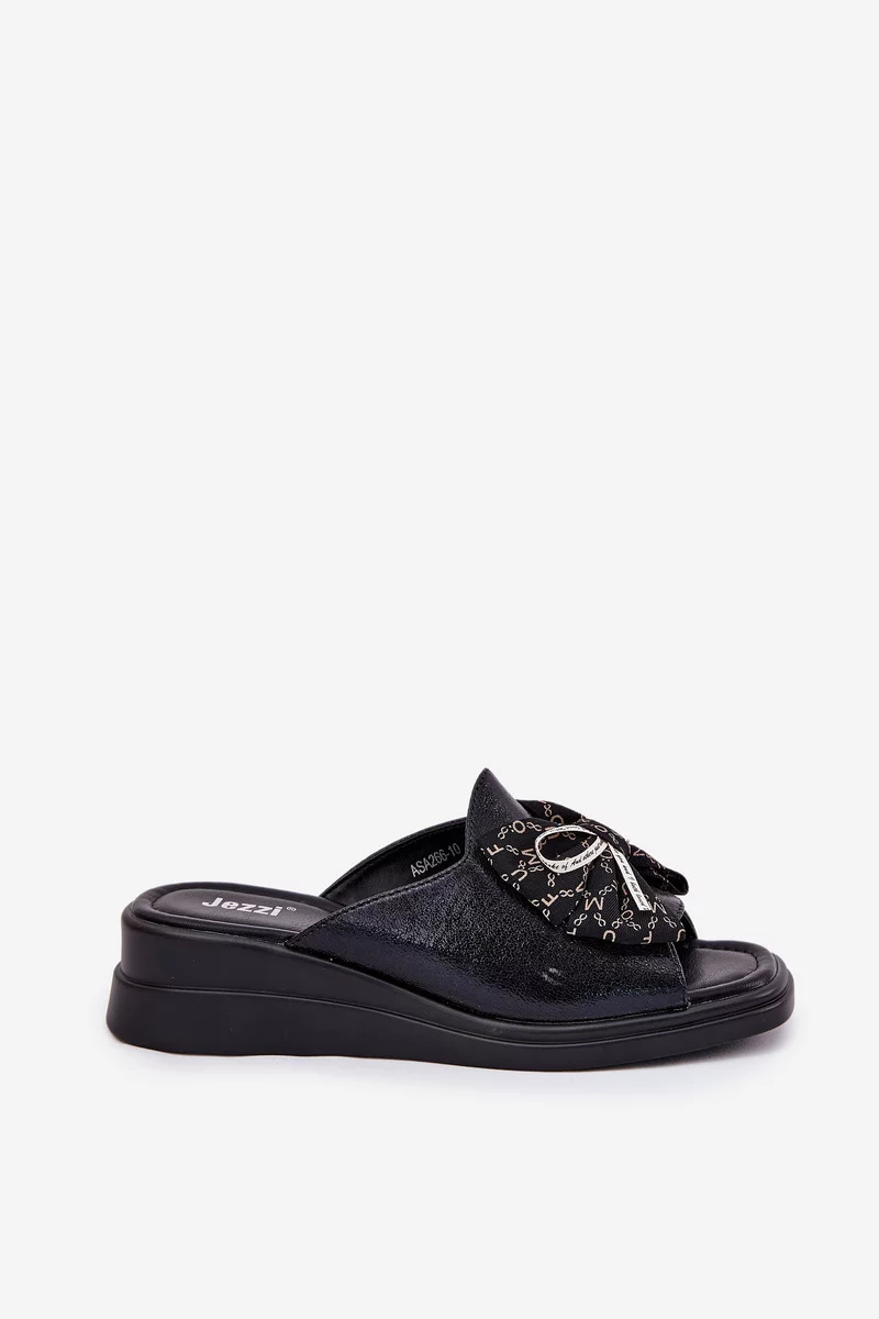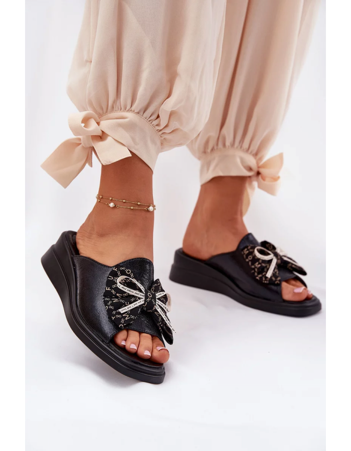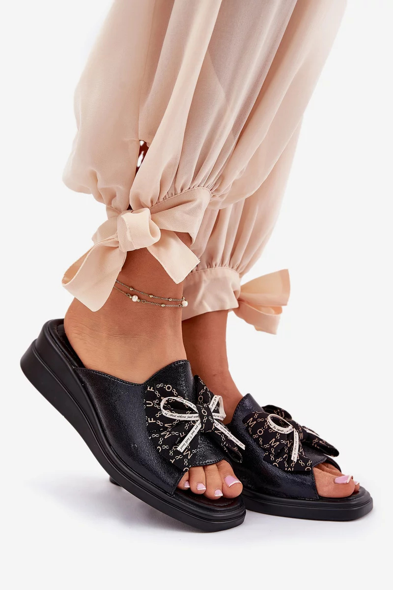 Černé pantofle s mašlí krásně doplní jednoduché outfity – zkombinujte je s džínami nebo letními šaty pro elegantní, ale pohodlný look.