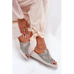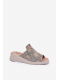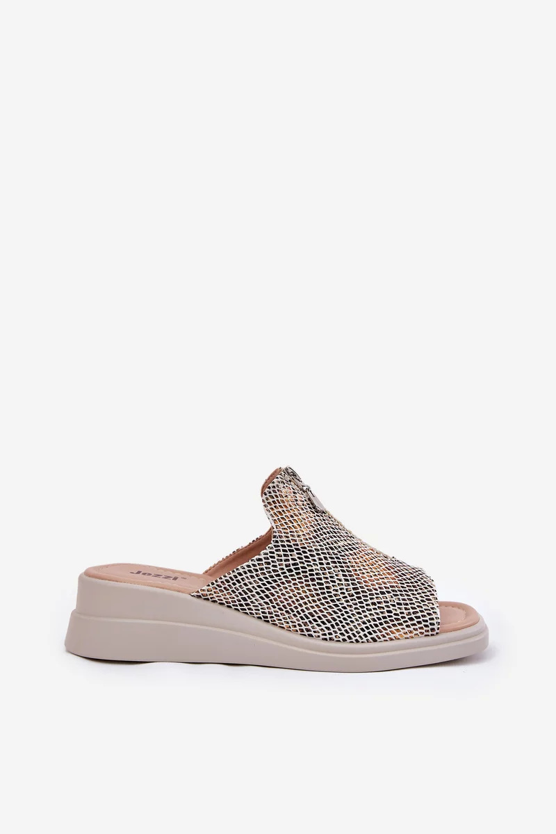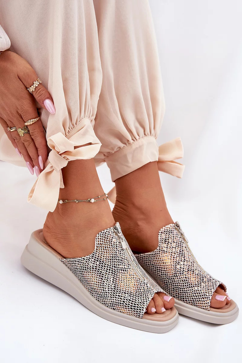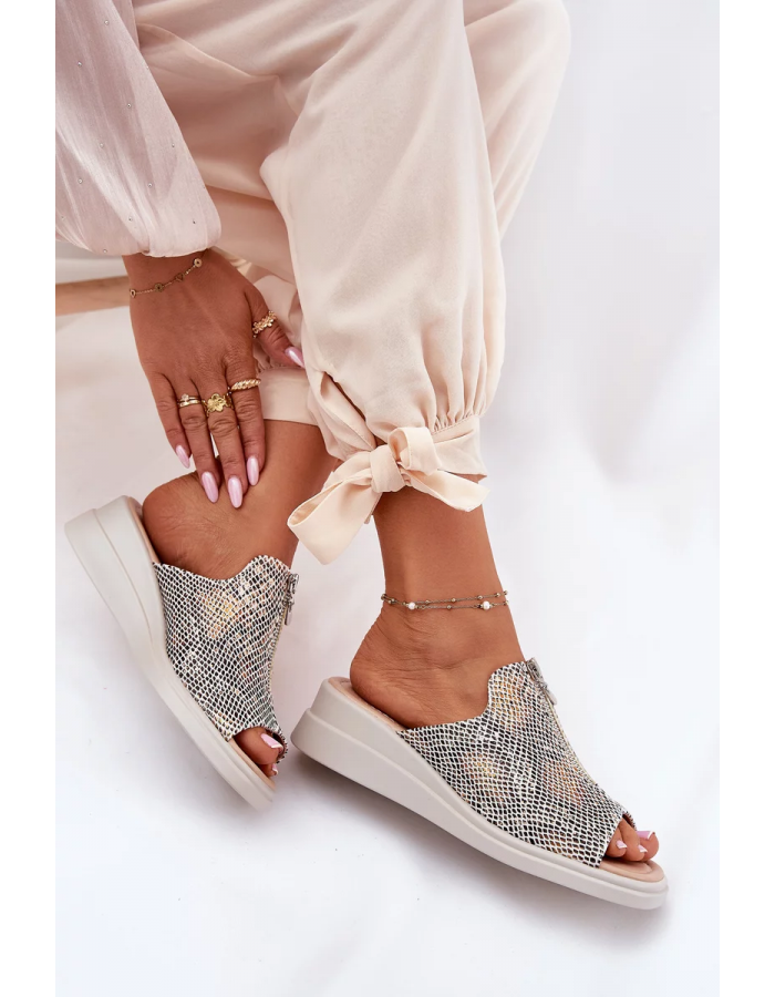 Dámské pantofle Irriva v béžovém provedení spojují módní prvky s pohodlným nošením. Klínová podešev opticky prodlužuje nohy a zároveň poskytuje pohodlnější došlap než klasický podpatek. Zvýrazněným detailem je elegantní zip na nártu a originální zvířecí vzor, který dodává pantoflím výrazný stylový akcent.