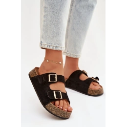 Černé pantofle na korkové platformě se zlatými přezkami skvěle doplní jak jednoduchý, tak elegantnější letní outfit.