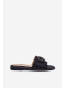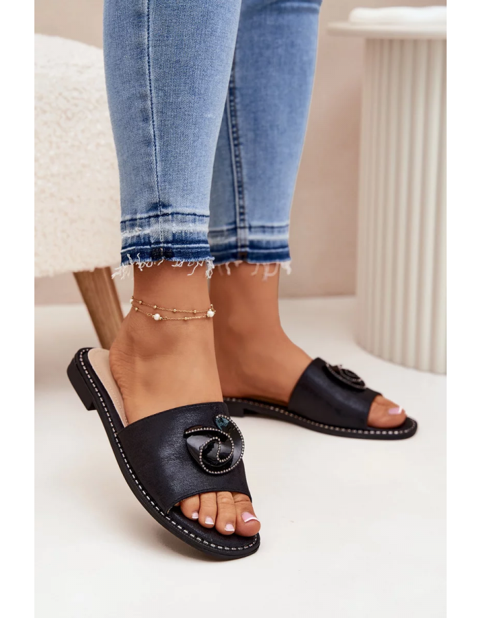 Černé pantofle s ozdobným detailem krásně doplní outfit v neutrálních barvách a dodají mu elegantní, ale nenucený styl.
