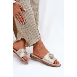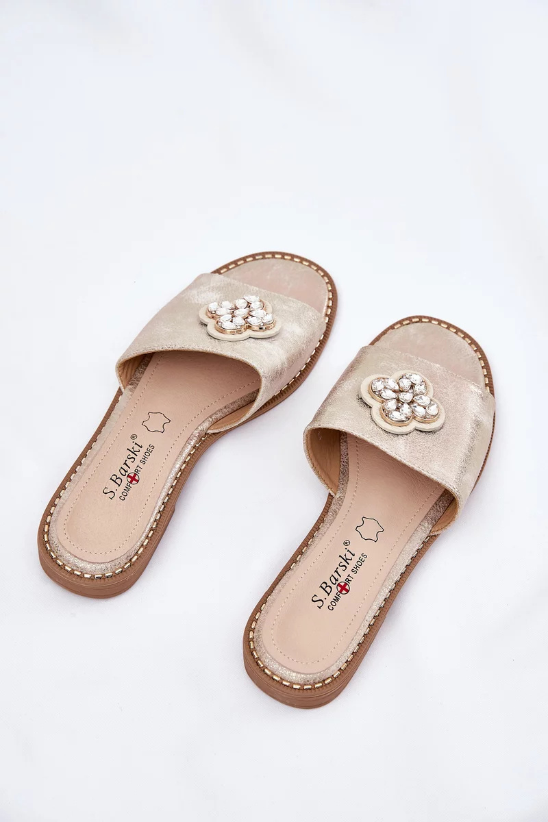 Dámské pantofle S.Barski KV51-087 v elegantním zlatém provedení kombinují pohodlí s módním designem. Nízký podpatek zajišťuje stabilní a komfortní došlap, zatímco ozdobný detail na nártu dodává obuvi sofistikovaný a stylový vzhled. Zlatá barva působí slavnostně a zároveň univerzálně – vhodná jak k dennímu, tak společenskému outfitu.