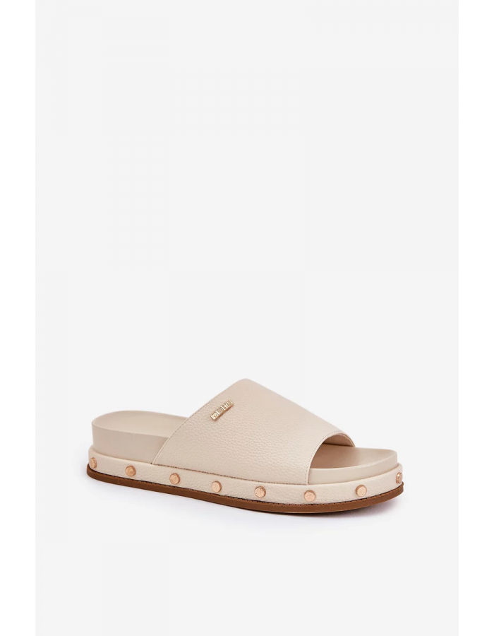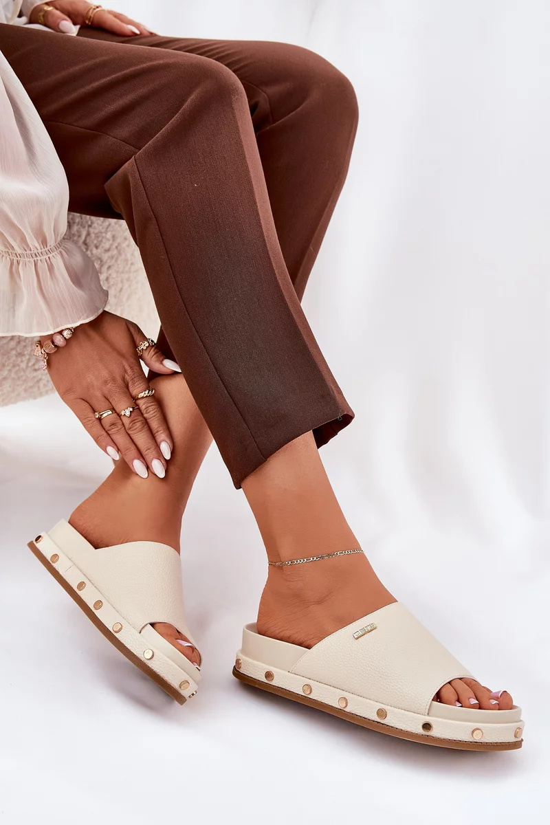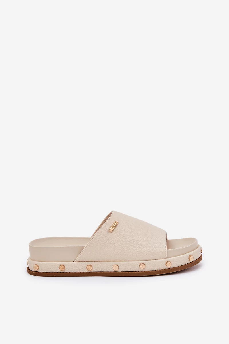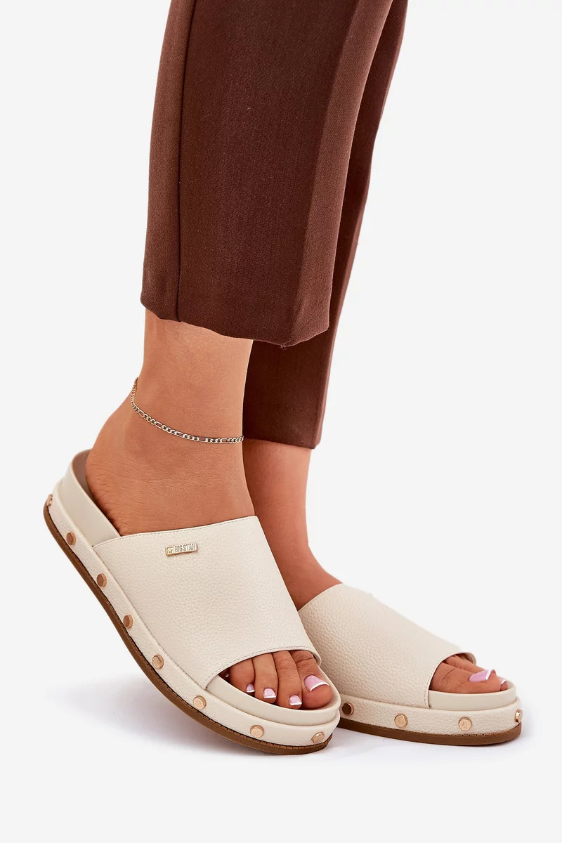 Styl a pohodlí v jednom – dámské pantofle Big Star v béžové barvě zaujmou nejen svou platformou, ale i výraznými kovovými cvočky, které dodávají obuvi moderní, lehce rockový nádech. Jsou ideální pro letní městský outfit i volnočasové nošení.
