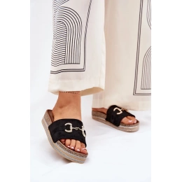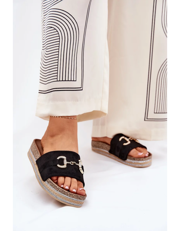 Dámské pantofle na platformě Morisela v černém provedení spojují pohodlí s módním designem. Zvýšená platforma zajišťuje stabilní a komfortní došlap, zatímco zlatá ozdoba s brokatem dodává obuvi elegantní a výrazný vzhled. Černá barva působí nadčasově a snadno se kombinuje s různými outfity.