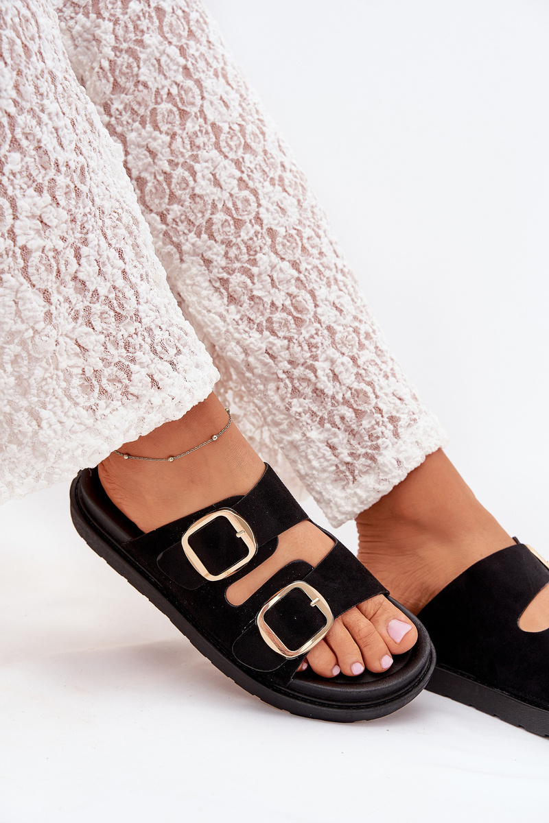 Dámské pantofle na platformě jsou stylovou volbou pro letní dny, kdy chcete spojit pohodlí s výrazným designem. Zlaté přezky dodávají obuvi elegantní kontrast, zatímco zvýšená podešev přispívá k pohodlnějšímu došlapu při chůzi. Černé provedení je nadčasové a snadno kombinovatelné s letními outfity.