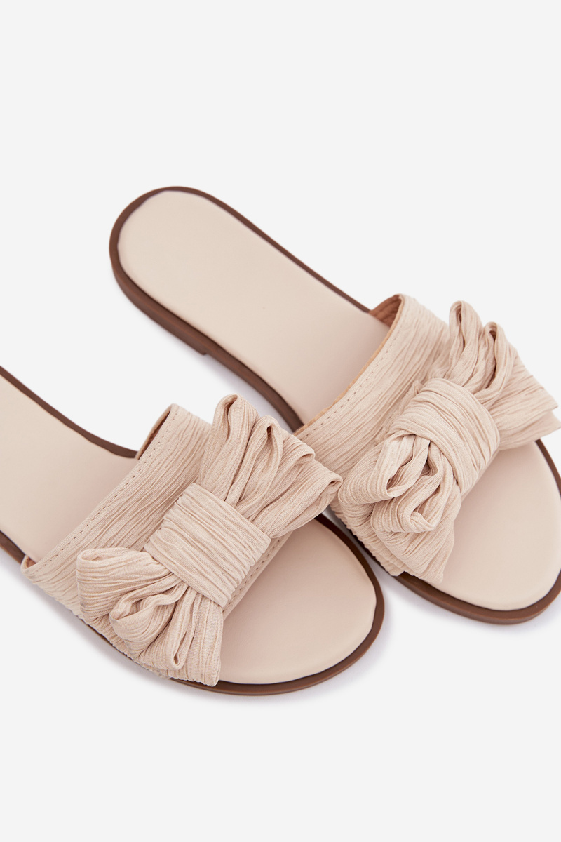 Béžové pantofle s mašlí krásně doplní outfit v přírodních tónech, lněné šaty, sukně nebo světlé kalhoty.