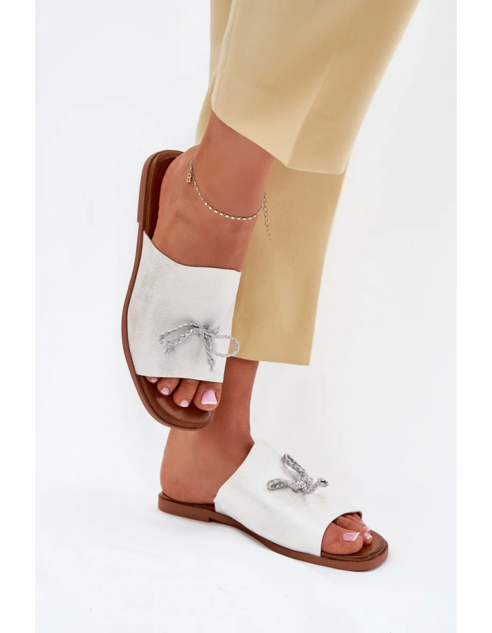 Stříbrné pantofle s ozdobným vázáním krásně doplní jednoduchý outfit v neutrálních barvách a stanou se jeho výrazným detailem.