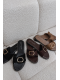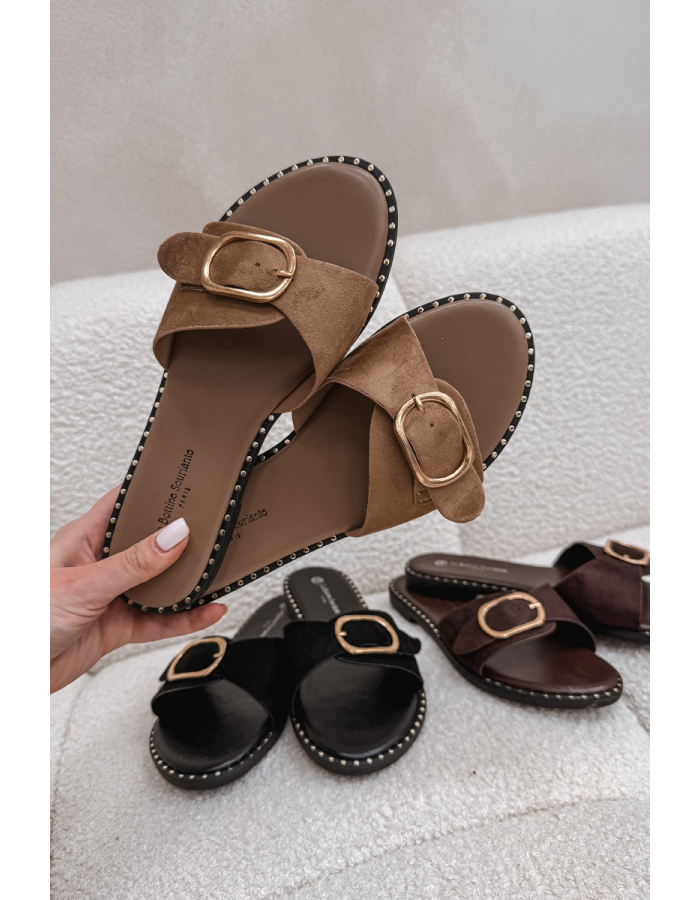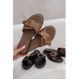 Camel pantofle se zlatou přezkou krásně doplní outfit v přírodních barvách, lněné šaty, sukně nebo světlé kalhoty.