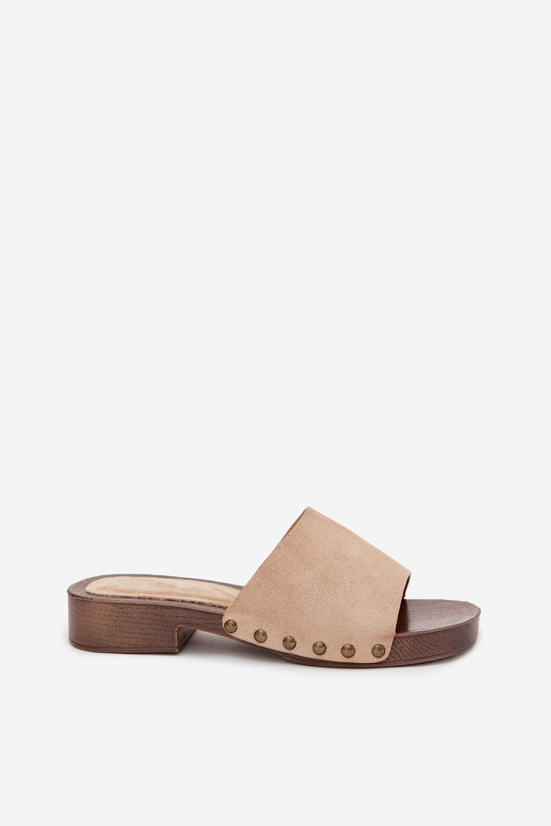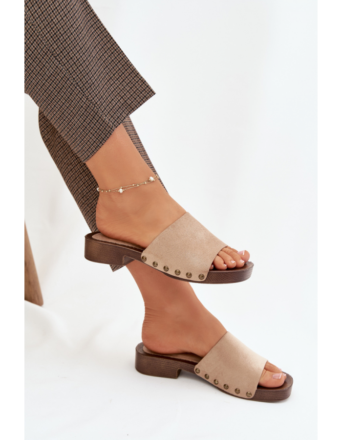 Béžové pantofle se zlatými cvočky skvěle doplní outfit v bílých, krémových nebo pastelových tónech a dodají mu elegantní vzhled.