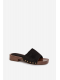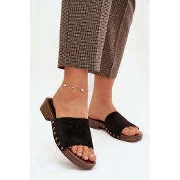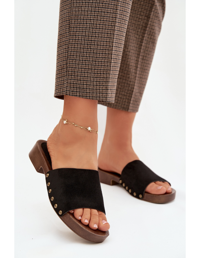 Černé pantofle se zlatými cvočky skvěle doplní jak jednoduchý, tak elegantnější letní outfit a dodají mu výrazný akcent.