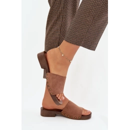 Hnědé pantofle se zlatými cvočky krásně doplní outfit v béžových, krémových nebo bílých tónech a dodají mu elegantní akcent.