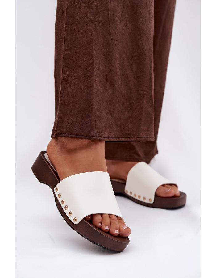 Bílé pantofle s cvočky krásně doplní outfit v pastelových nebo neutrálních tónech a dodají mu svěží letní vzhled.