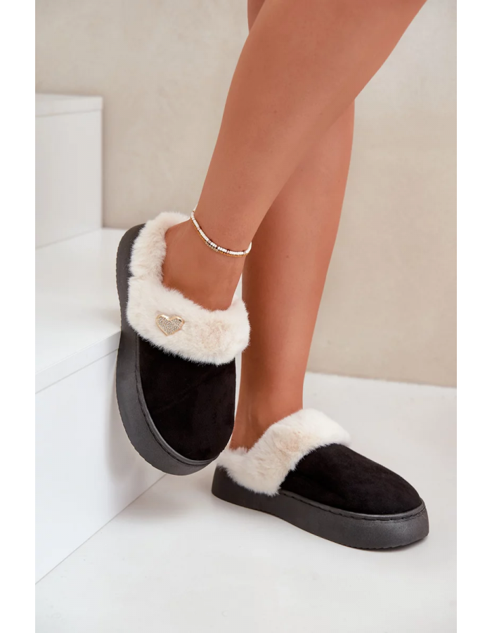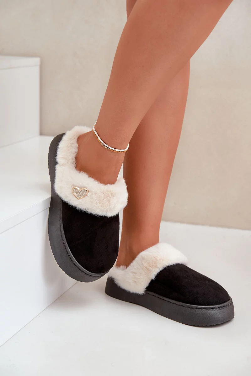 Vyrobené z měkké kožešiny, zdobené roztomilými srdíčky, zajišťují útulnost a pohodlí. Zabudované na silné podrážce, která skvěle izoluje od studené podlahy. Ideální na nošení doma, dodávají špetku stylu každodennímu odpočinku.
