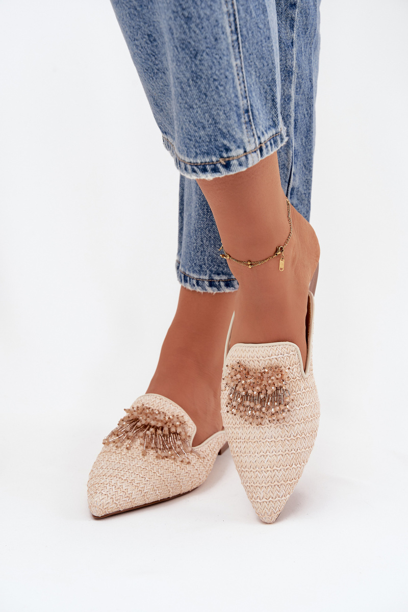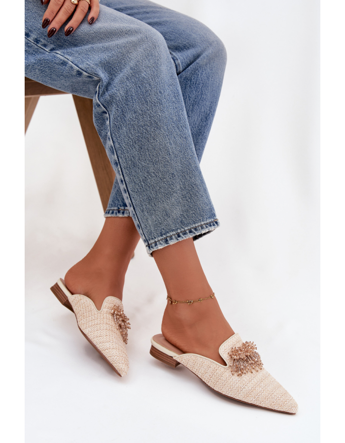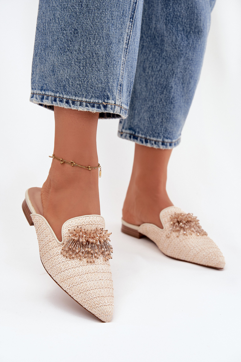 Béžové dámské pantofle Katrine s elegantní ozdobou kombinují pohodlí a styl. Lehké a měkké pantofle zajišťují komfortní nošení po celý den, zatímco ozdoba dodává obuvi jemný a elegantní vzhled. Ideální volba pro domácí nošení i letní volnočasové outfity.
