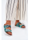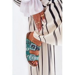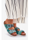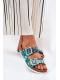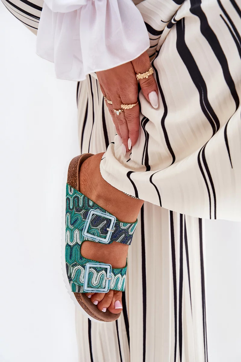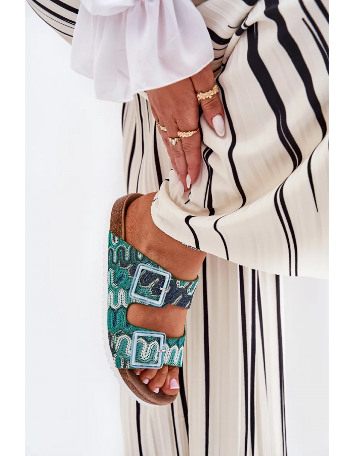 Dámské pantofle S.Barski v trendy zeleném provedení spojují pohodlí s originálním designem. Pohodlná plochá konstrukce je doplněná stylovými přezkami a brokátovým zdobením, které dodává obuvi módní a výrazný charakter. Zelená barva působí svěže a živě — ideální pro letní outfity, které chcete oživit barevným akcentem.
