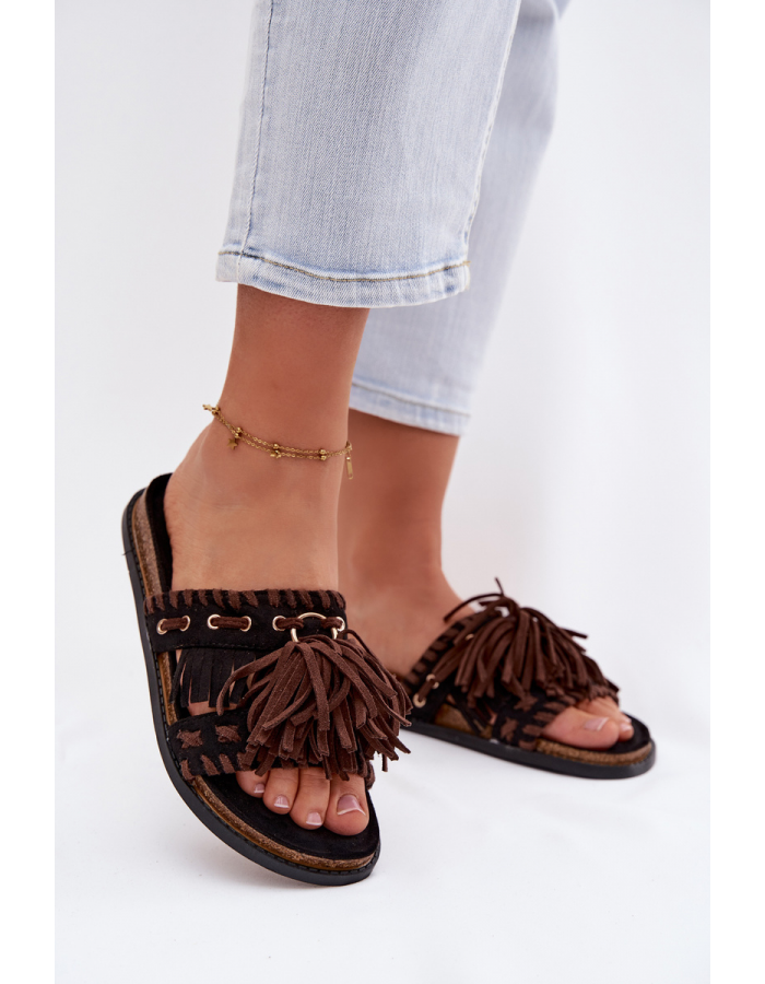 Černé pantofle s třásněmi skvěle doplní jednoduchý outfit a dodají mu elegantní, lehce bohémský nádech.