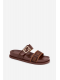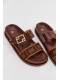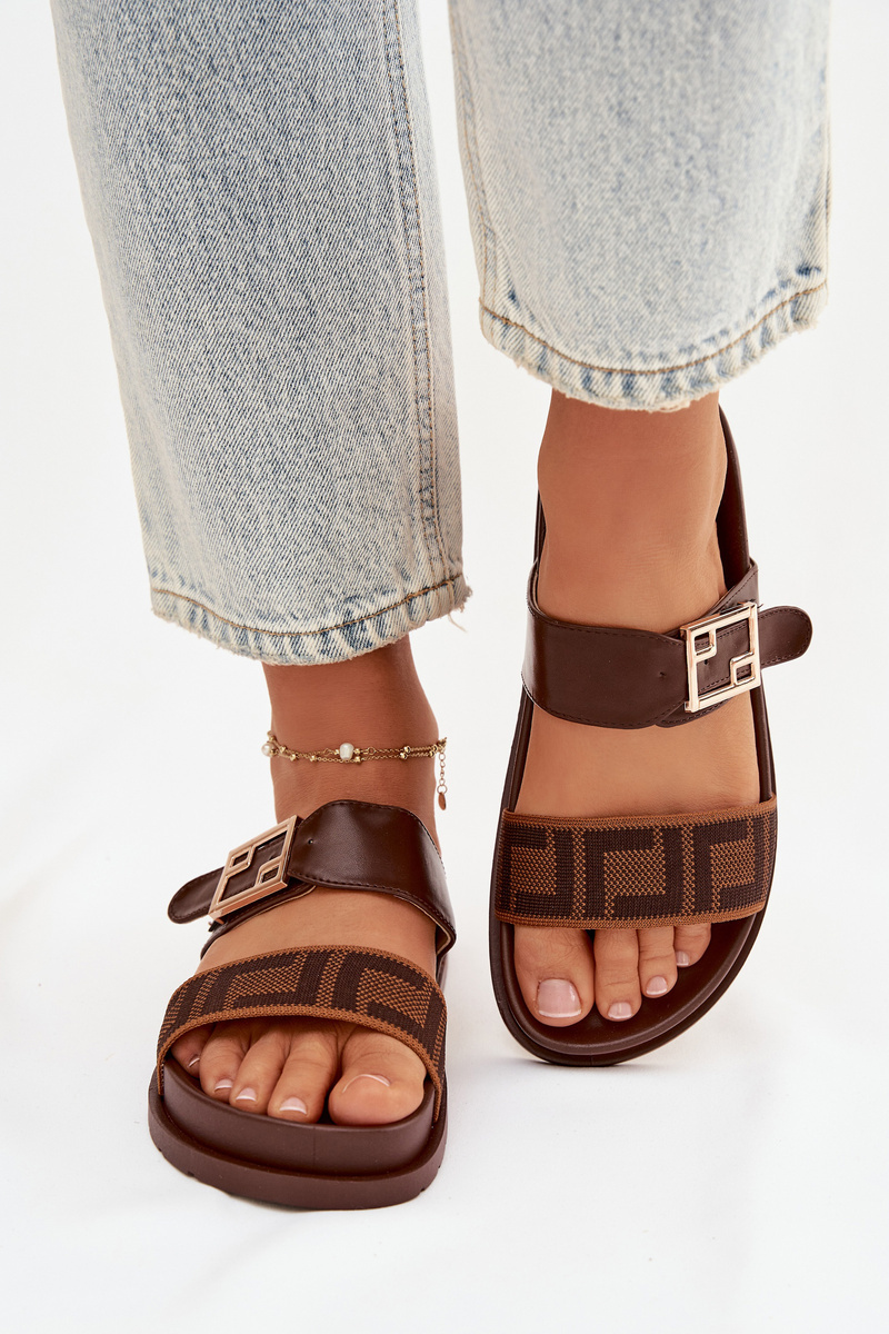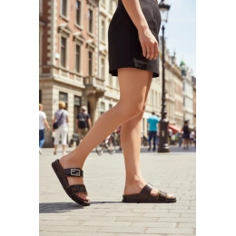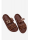Hnědé pantofle se zlatou přezkou krásně ladí s neutrálními barvami — zkombinujte je s béžovými kalhotami, denimem nebo jednoduchými šaty pro stylový a vyvážený look.
