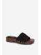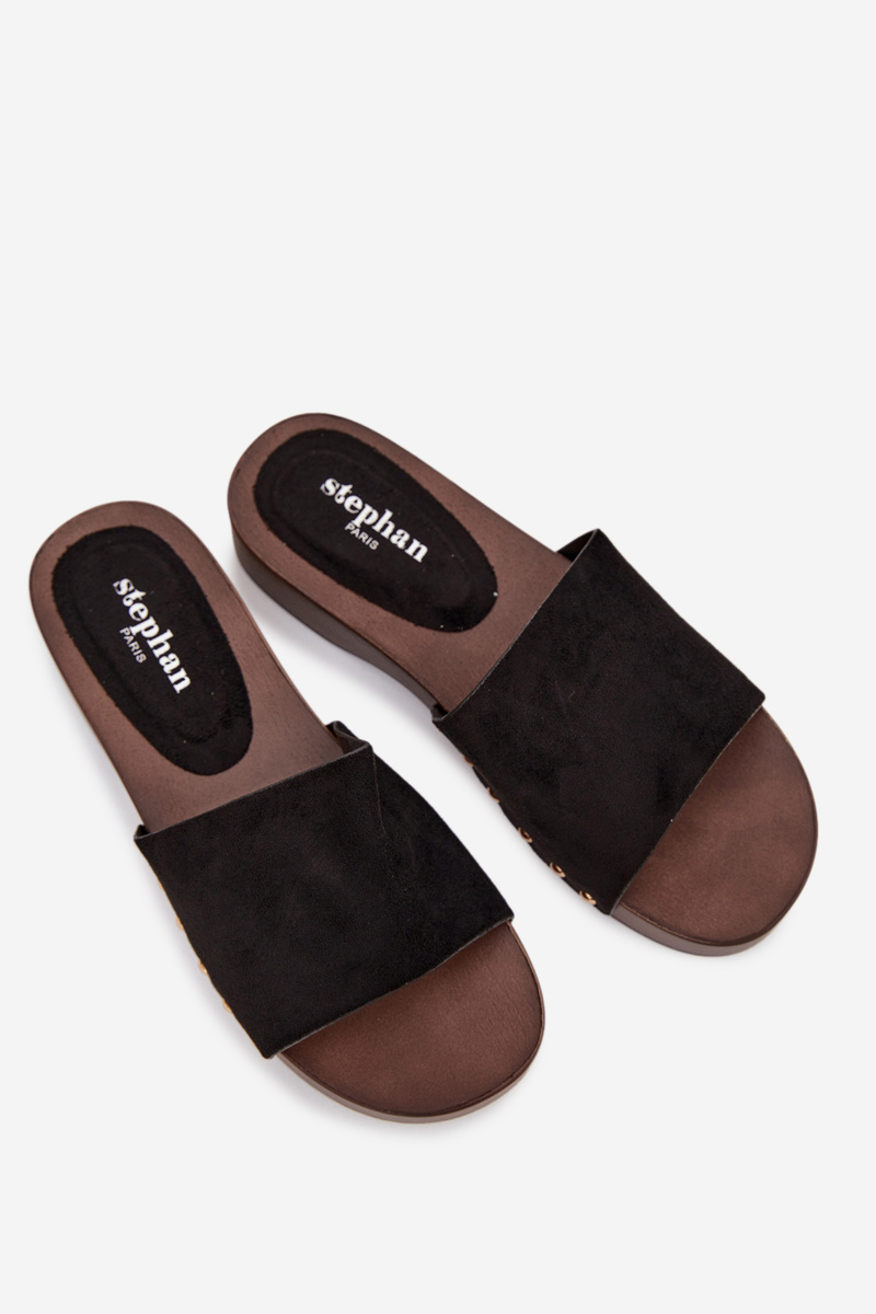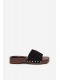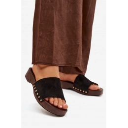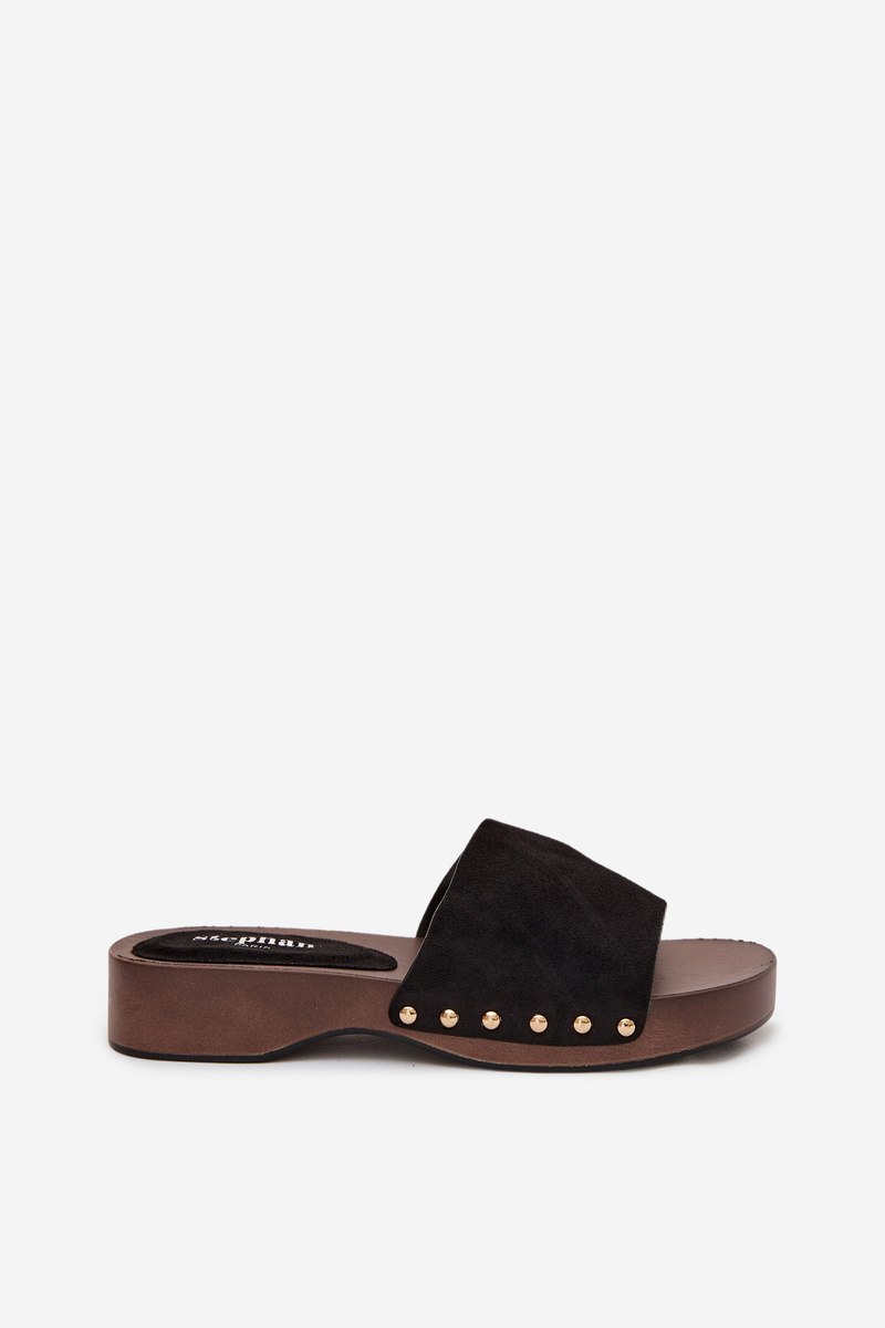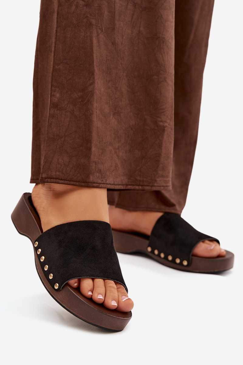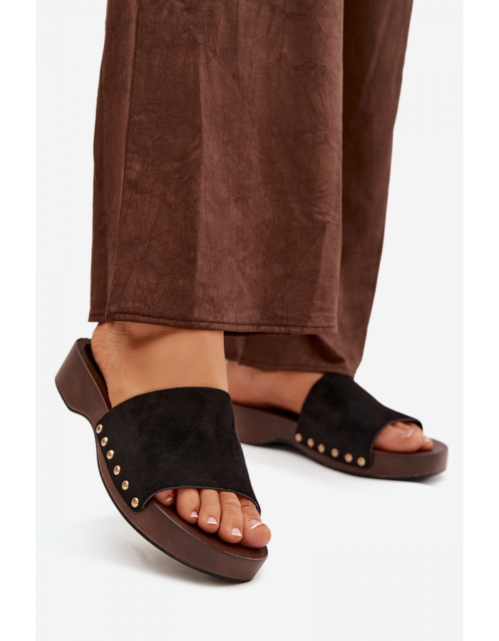 Černé pantofle se zlatými cvočky skvěle doplní jak jednoduchý, tak elegantnější letní outfit a dodají mu výrazný akcent.